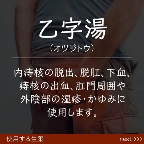 体力が中等度以上の方向けで、痔核や裂肛にも効果があります。特に便秘傾向で硬い便が原因で起こる痔の症状に適しています。