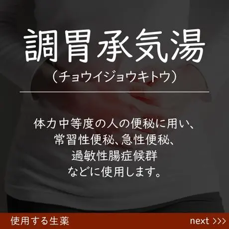 - 症状: 頭重感やのぼせ、腹部膨満感を伴う便秘
