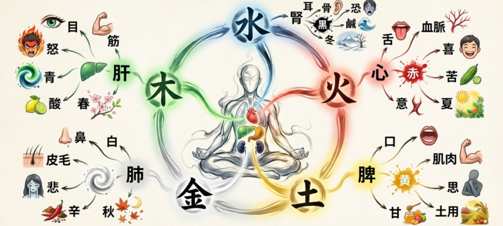 人体の臓器や機能も五行に対応させて考えます。