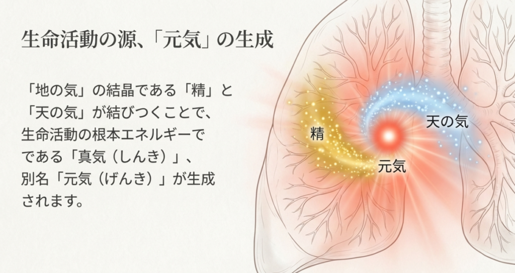 呼吸によって取り込まれた 天の気 と精が結合します。