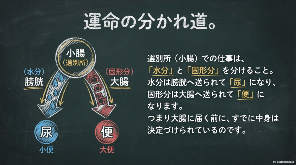- 水分は膀胱へ → 尿になる
