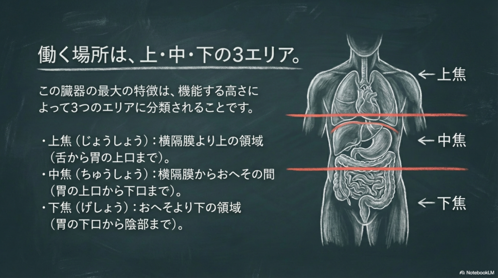 働く場所によって 上焦・中焦・下焦 の三つに分けられる点です。