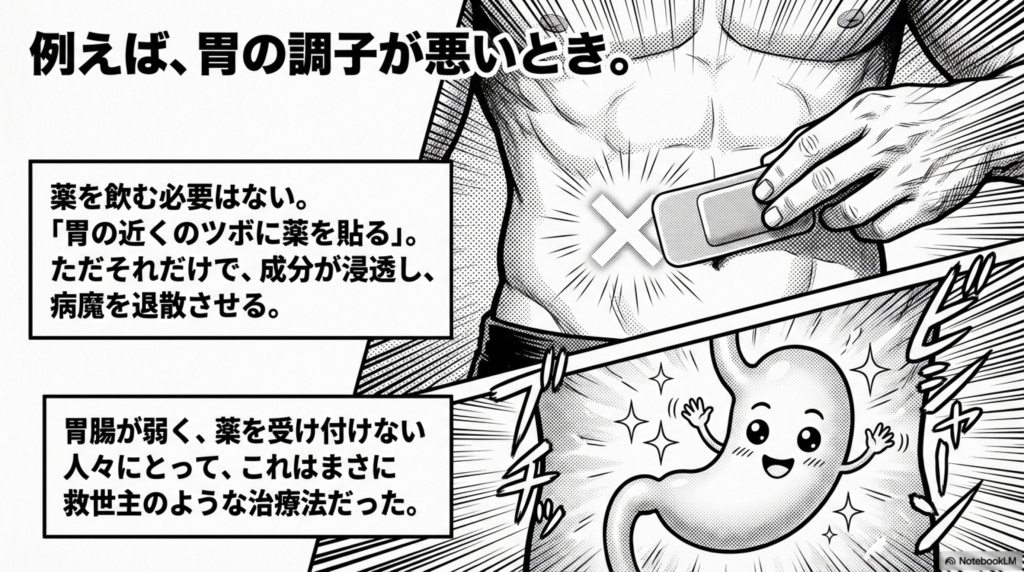 - 胃の調子が悪ければ、胃の近くのツボに薬を貼る
