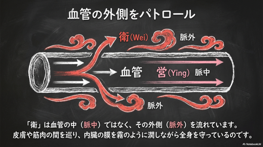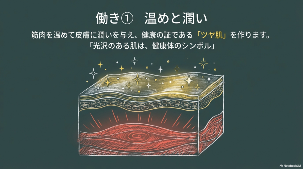 衛は体表を温め、筋肉や皮膚に潤いを与えます。
