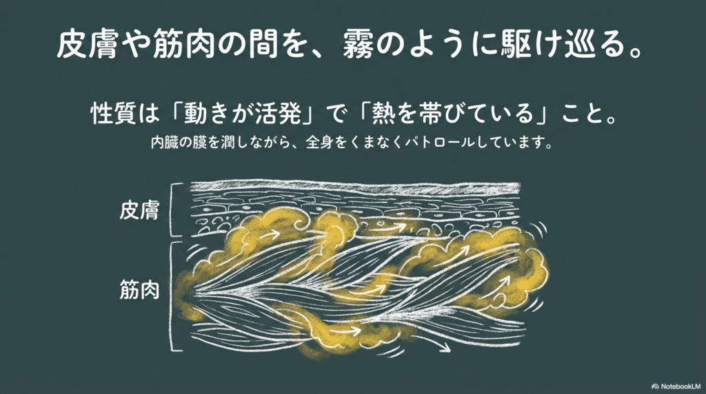 皮膚や筋肉の間、内臓の膜の周囲を巡りながら、