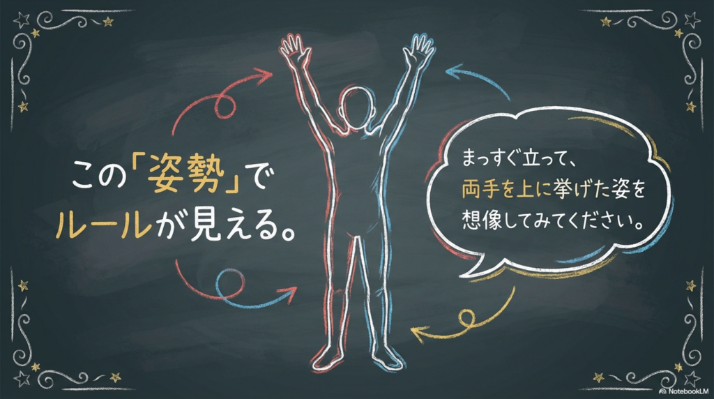 まっすぐ立ち、両手を上に挙げた姿勢を想像してください。