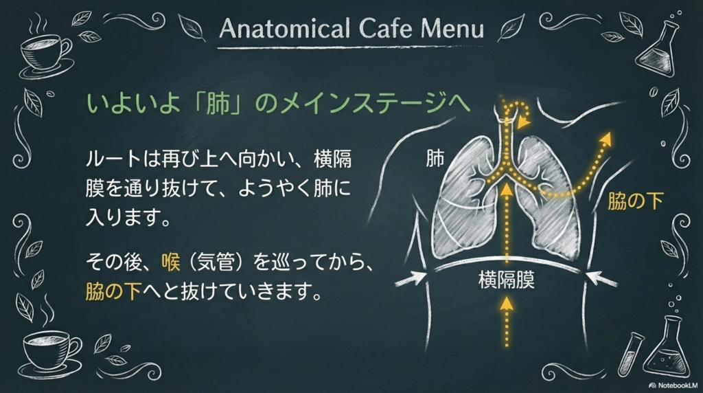 そして再び上へ向かい、横隔膜を通過して肺へ入り、