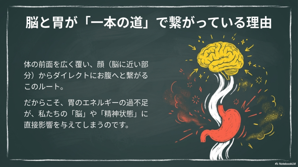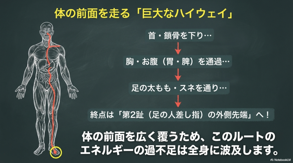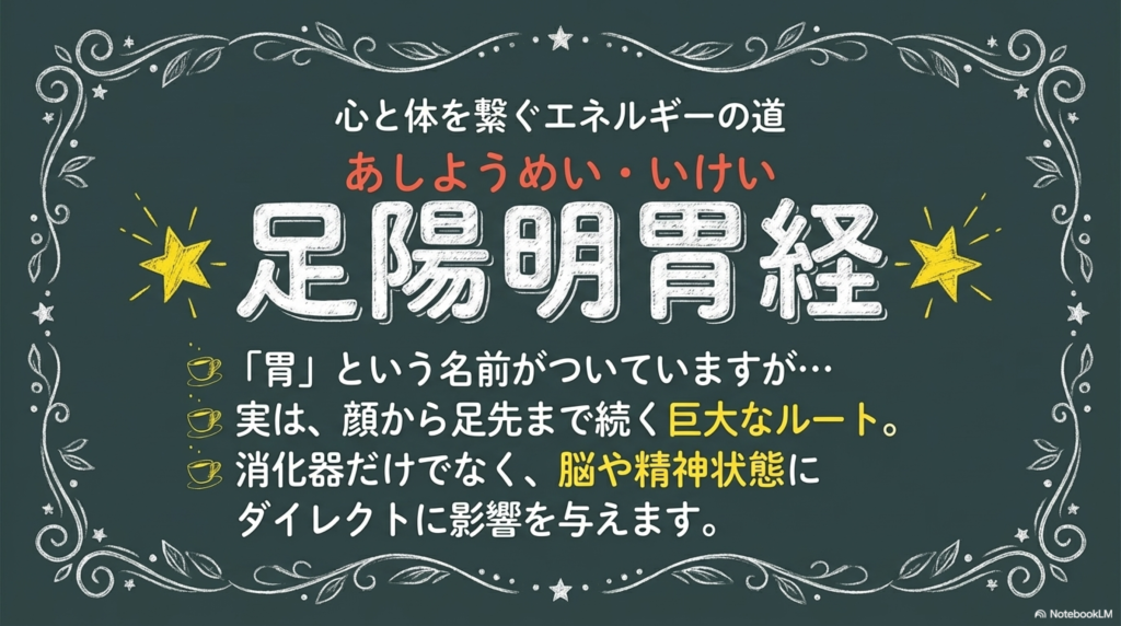 これは胃経のエネルギーが精神状態にも影響するという考えを表しています。