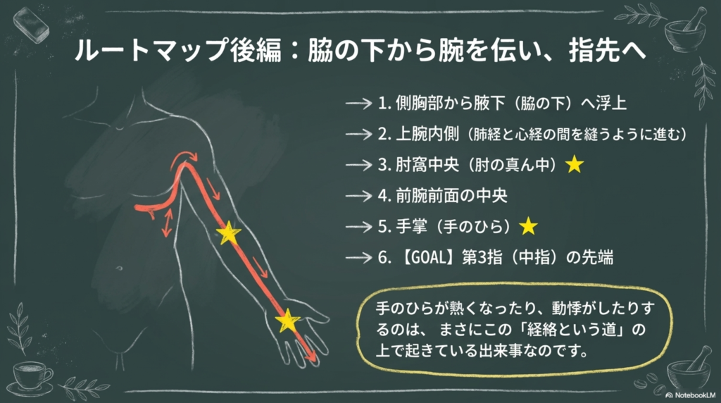 つまり、胸から腕、手のひらまでを結ぶ重要なルートなのです。