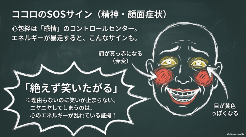 **「絶えず笑いたがる」**という特徴的な状態が現れるとも記されています。