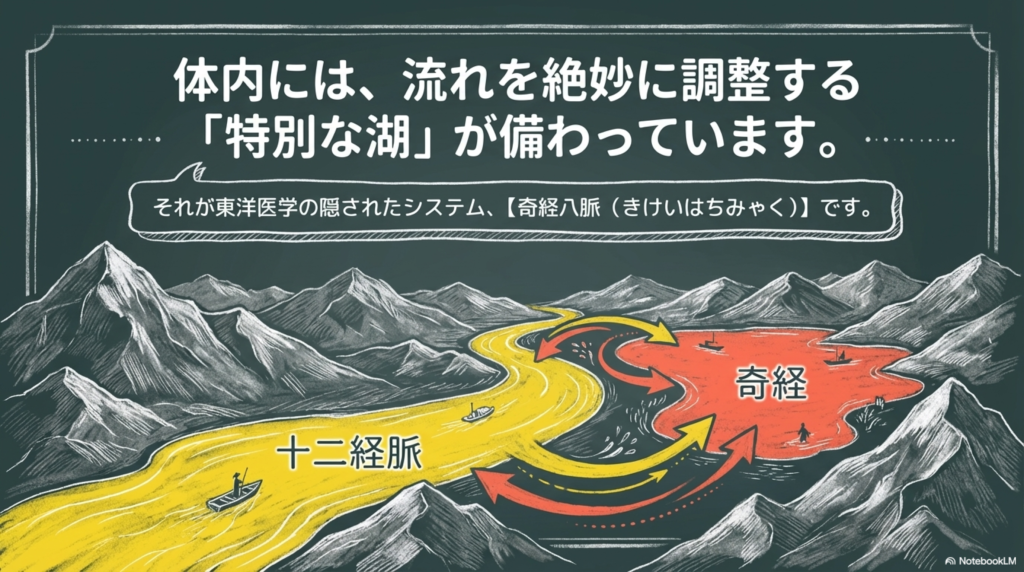 東洋医学では、十二経脈を絶えず流れる大河、そして奇経八脈を水を蓄える湖のように考えると理解しやすいとされています。