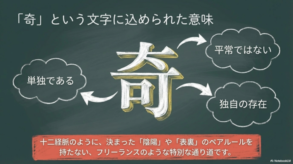 「奇経八脈」の「奇」という文字には、平常ではない、特別、単独であるといった意味があります。