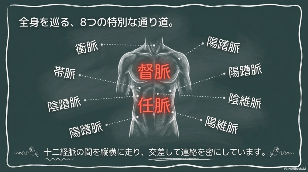 奇経八脈は、十二経脈とは異なる特別な役割を持つ、八つの重要な経脈です。