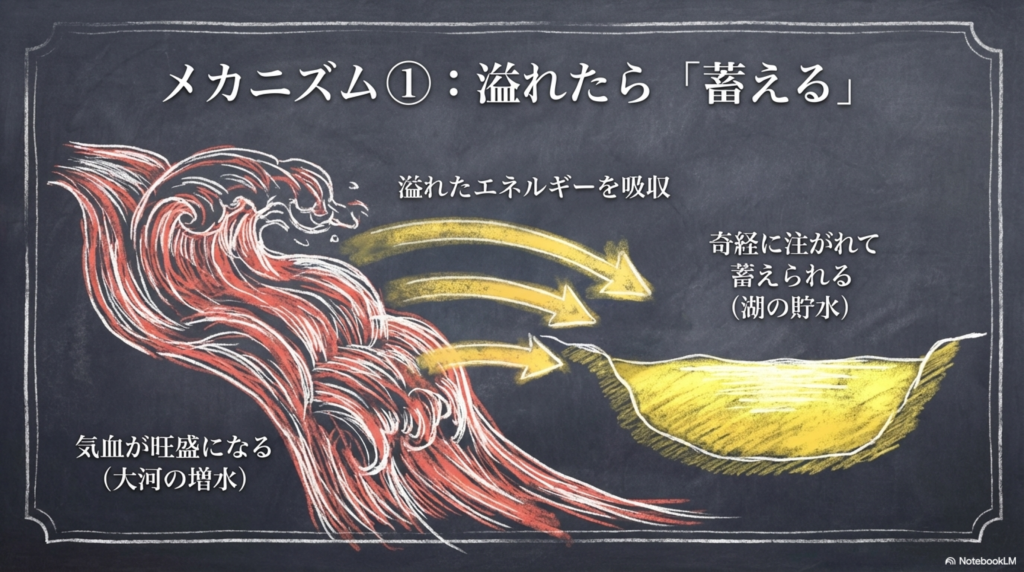 その働きは、大河である十二経脈の流れを調整する「湖」や「ダム」のようなものと考えるとわかりやすいでしょう。