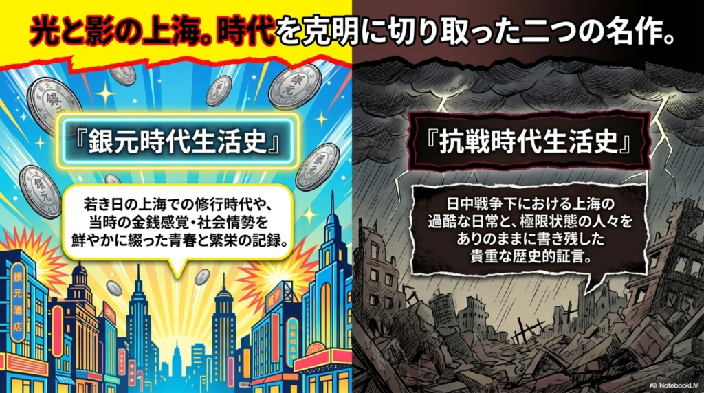 - 『抗戦時代生活史』では戦時下の厳しい現実を克明に描いています