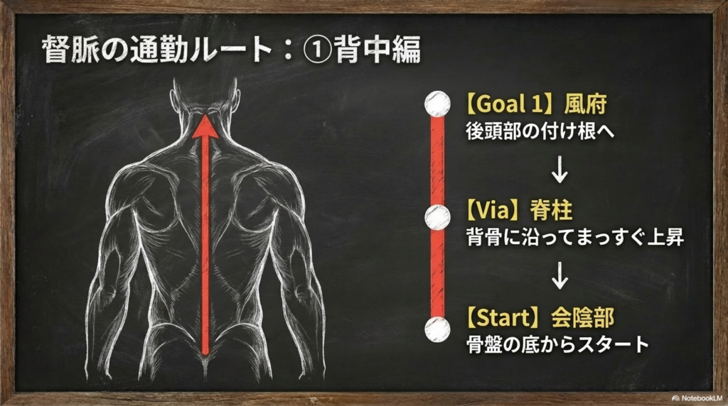 この流れを見ると、督脈が単に「背中のライン」ではなく、骨盤から脳、顔面にまでつながる非常に重要な中軸であることがわかります。