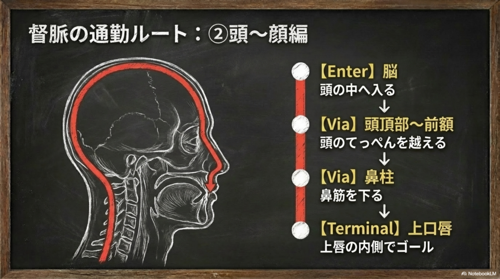 そして体表のルートとしては、さらに頭のてっぺんを越えて、額から鼻筋へと下り、最後は上唇の内側で終わるとされています。