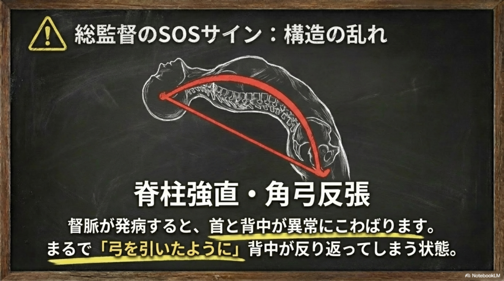 背中や腰のラインが強く緊張し、場合によっては弓のように反り返るような強いこわばりとして現れることもあります。