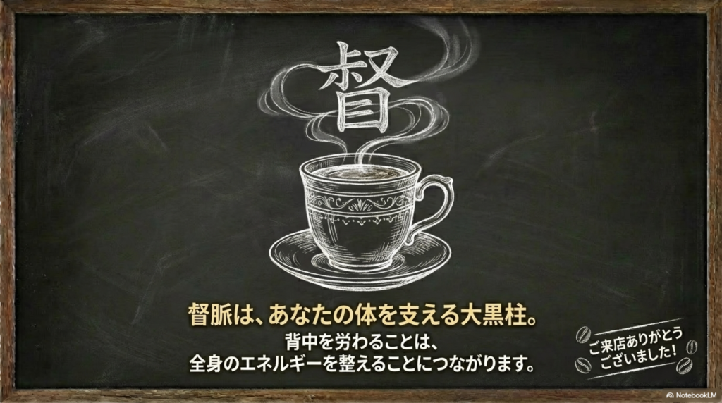 東洋医学では、全身の陽のエネルギーを統括する「総監督」として位置づけられており、脳や腎、姿勢、背骨、神経系の働きとも深く関わっていると考えられています。