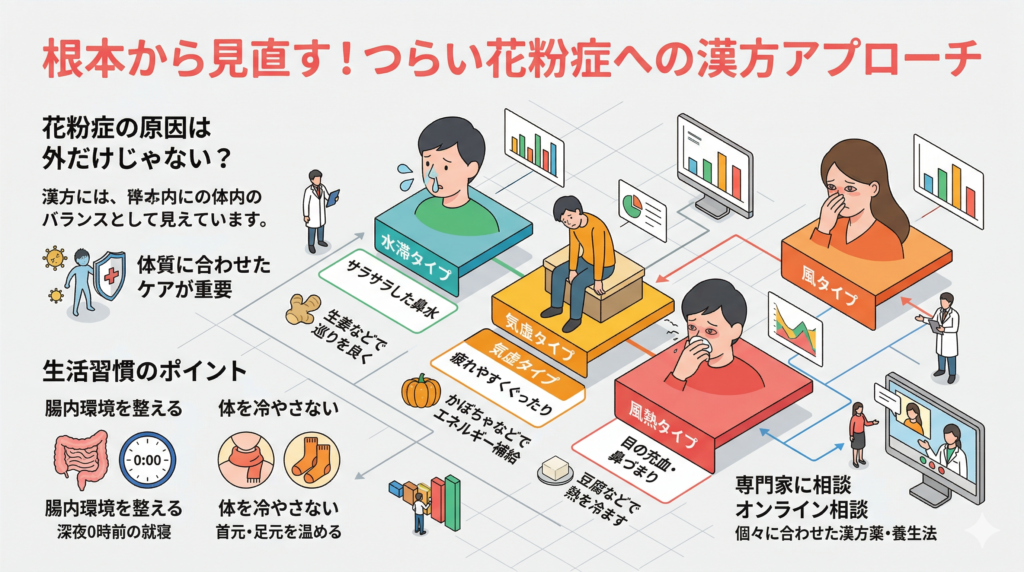 漢方では、花粉症を「体の内側が変化にうまく対応できていないサイン」と捉えます。