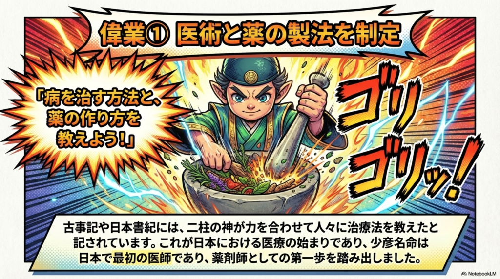 少彦名命の第一の功績は、人々に医術や薬の知恵を授けた存在として語り継がれていることです。
