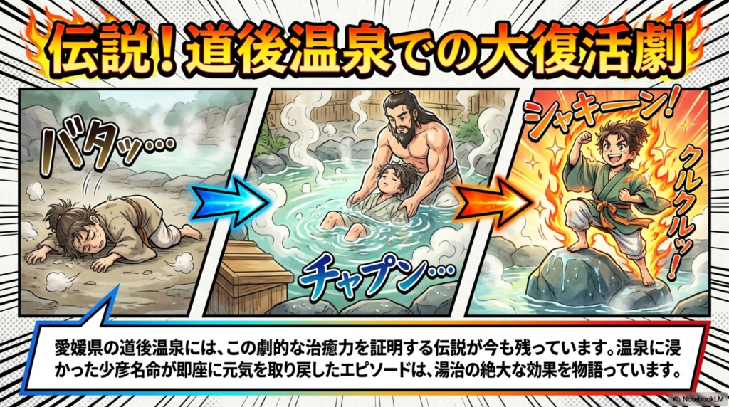 たとえば、愛媛県の 道後温泉 には、少彦名命が湯に浸かって元気を取り戻したという伝承が今も残っています。道後温泉の観光案内でも、この神話に由来する説明が見られます。