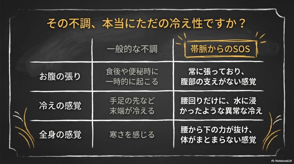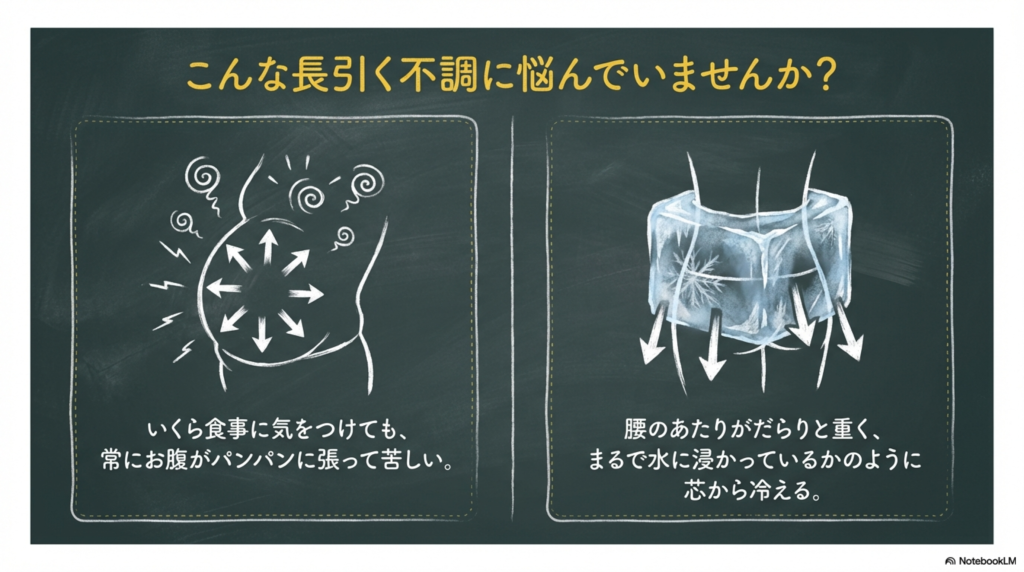 原因がはっきりしないお腹の張りや、腰まわりの強い冷え。