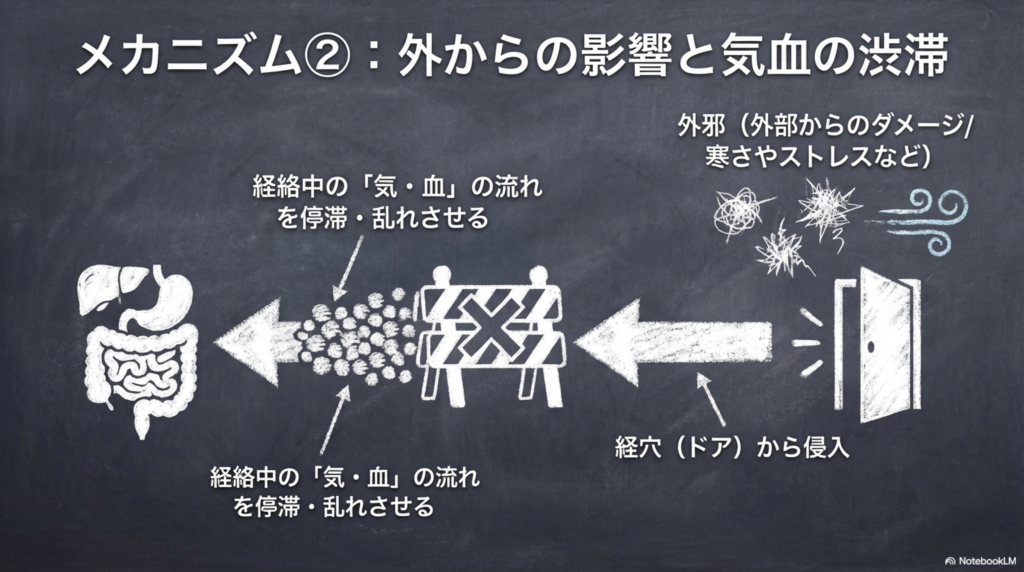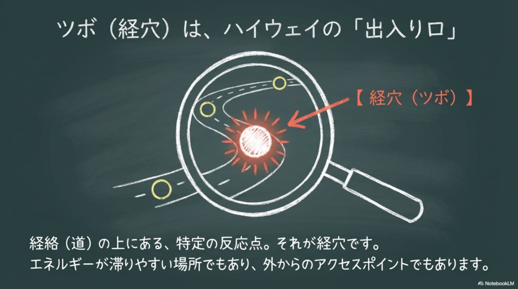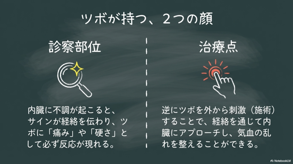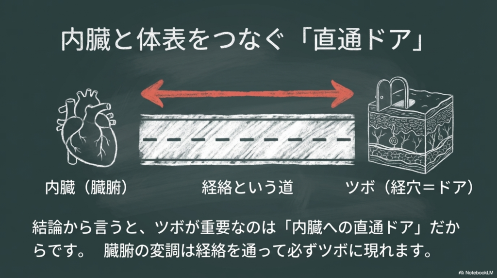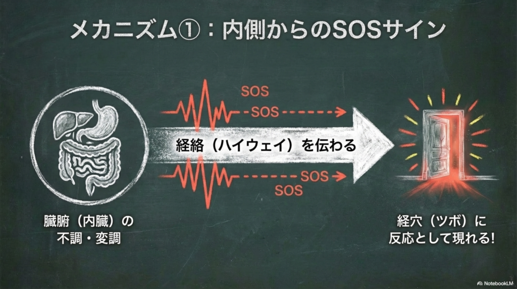 その影響は経絡を通じて体表へと伝わり、ツボに変化として現れます。