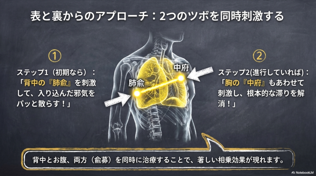 - 症状が進んだ場合 → 募穴(お腹・胸)も刺激する
