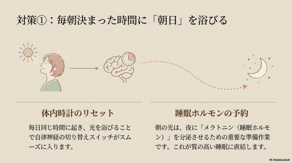特に起床後すぐに光を取り入れることがポイントです。