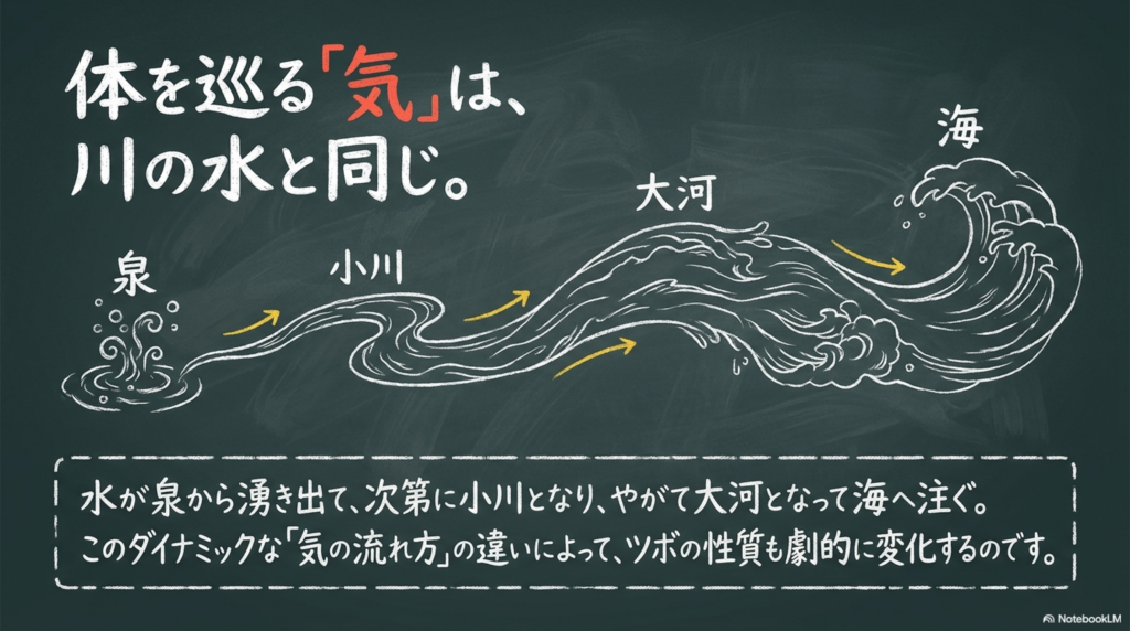気の流れを水の流れに例えて理解することができます。