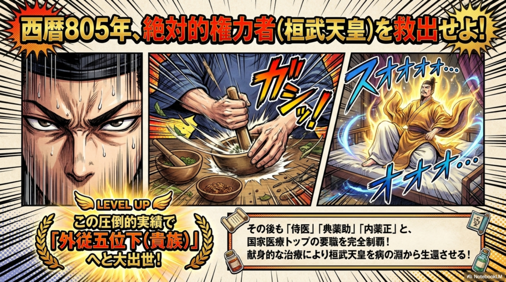伝承では、病に倒れた桓武天皇の治療にあたり、